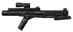 The E-11 BlasTech Blaster Rifle is an automatic blaster rifle commonly carried by Imperial soldiers. They have been manufactured since the end of the Clone Wars, and they are designed from the DC-15S Blaster Carbine (a condensed version of the DC-15A Blaster Rifle). In form and function, they are the successor to the Galactic Republic's DC-15 Blaster Rifle. The weapon is an automatic blaster rifle, shooting several bolts in quick succession. It is the most powerful of the mainstream soldiers' blasters, but also the most inaccurate at long range. This is one of the only four weapons from the original Battlefront games to return in the DICE reboot.