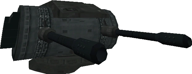 The Heavy Ship Cannons take on the appearance of a DBY-827 Dual Turbolaser. However, the main difference between the DBY-827 and the Heavy Ship Cannons is that the Heavy Ship Cannons fire energy beams, while the DBY-827 fires energy particles, not beams. The other big difference is that the DBY-827 has three settings: Stun, Kill, and Incinerator, which will destroy whatever it hits. They are used primarily for Ship to Ship Combat, but in the Battlefront variant, they are used to protect the Hangar Bays. Using the cannons for that purpose is a good choice but not usually preferred. Due to its massive size and slow rotation speed, these turrets are normally flanked by laser cannons to prevent bombing runs. These are easy but hard to take down due to the firepower. Originally in the game the Cruisers had about 6 of these cannons. This can be seen on multiple original screenshots before it was cut from the final version of the game.