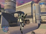 The Jetpack is a propulsion device used by Jango and Boba Fett, as well as the Republic Jet Trooper. It allows the unit to hover in midair, and even fly, depending on where the unit is aimed. It has a limited amount of fuel (which will automatically recharge when not in use). The fuel bar is displayed at the left of the screen when the jetpack is in use. When this bar runs out, the jetpeck turns off, and sends you plummeting to the ground. However, all jetpack equipped units do not take damage from falling. It is great for reaching places unaccessable to the other units, and for swooping in on opponents and shooting at them before they have time to turn around and see you flying off. Be advised: these units are weak in comparison with all other units. One shot from a sniper rifle anywhere on the body ensures an instant death.