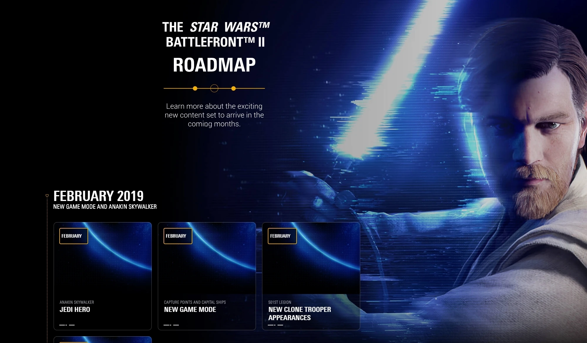 The Roadmap[1] is a calendar containing the content updates in the live service of DICE's Star Wars Battlefront II. Previously, the Roadmap also displayed future content updates. The Roadmap is an interactive page that was created on December 14, 2018 and can can be found here.